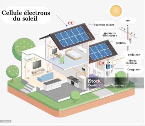 - Ensuite le courant direct CC est transformé en courant alternatif (CA) grâce à l’onduleur. Ce courant permet d’alimenter les logements, comme les entreprises.